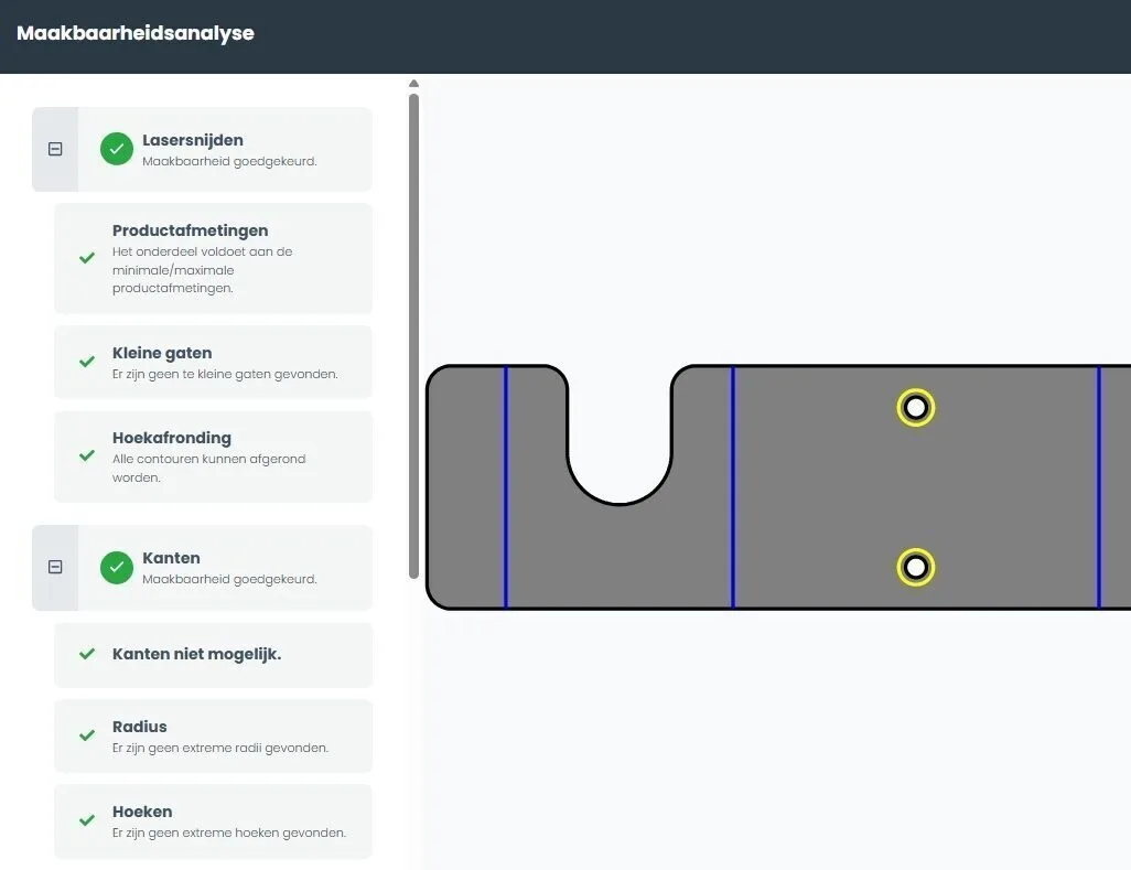 With support for no fewer than 18 file formats, you can upload your design, specify the desired material and quantity, and receive an immediate price based on the selected delivery time. Thanks to the integrated feasibility analysis, you gain immediate insight into the manufacturability of your design, including any optimizations.